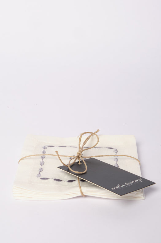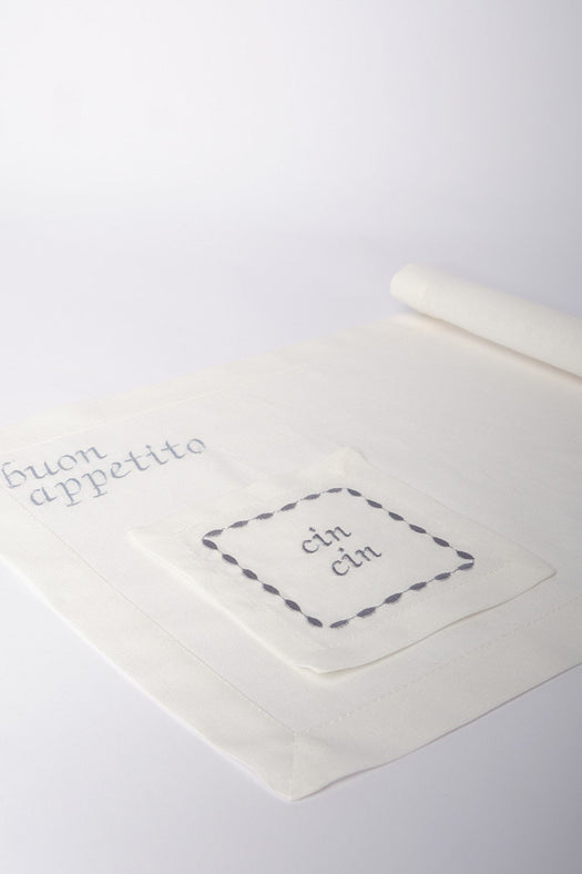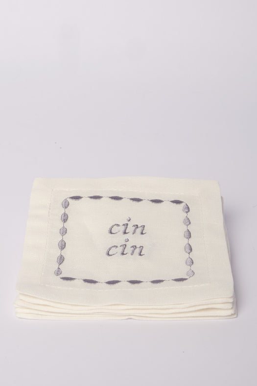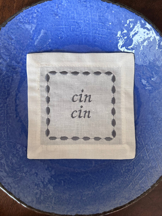 Introducing our elegant Casa Marta coasters, perfect for adding a touch of style to your Italian summer table setting. Each coaster is square-shaped, featuring an embroidered border and the phrase "Cin Cin" in the center, ideal for toasting with elegance.