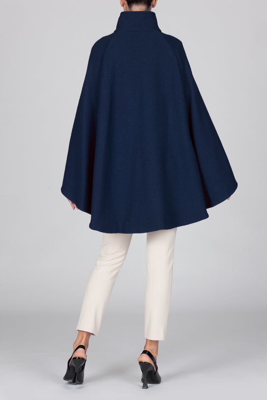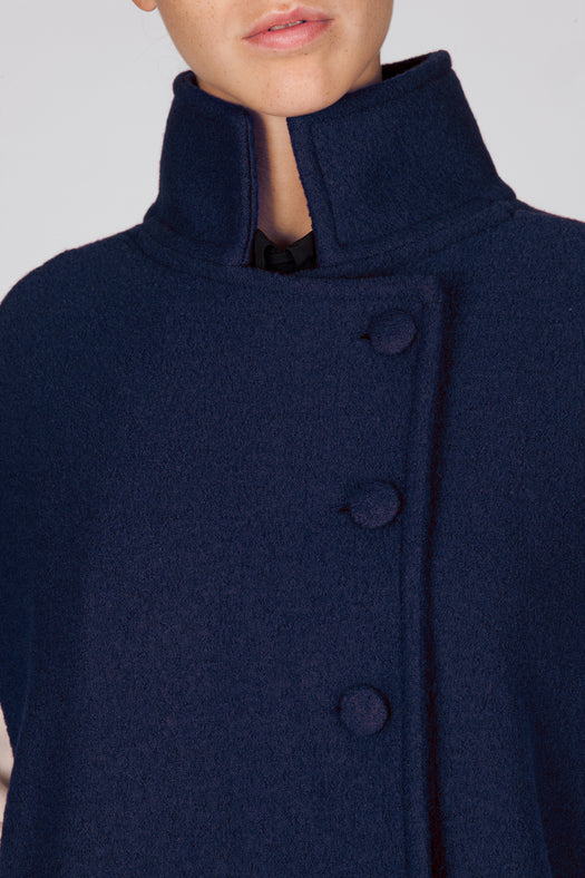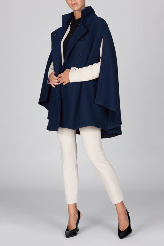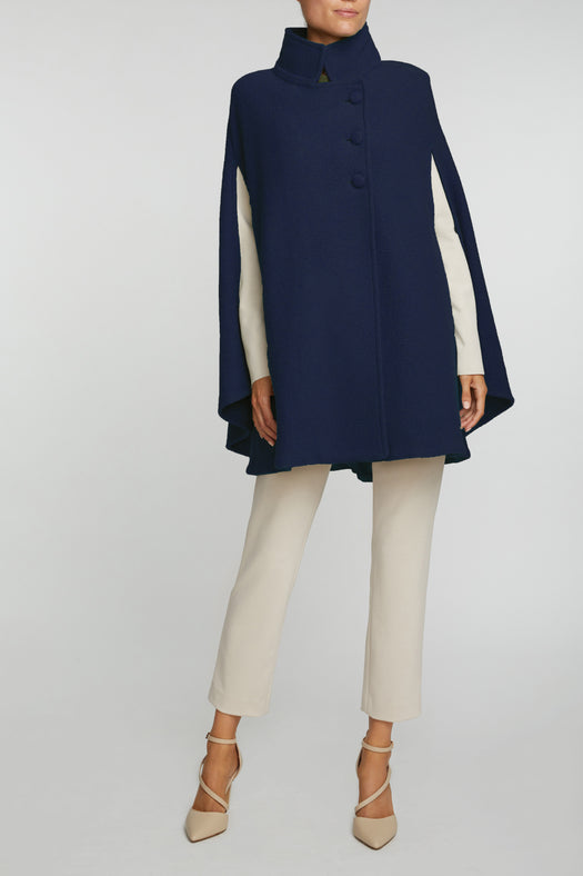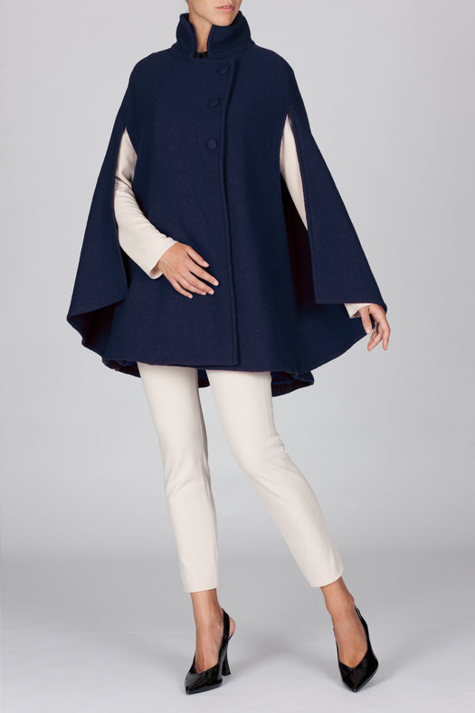 Tailored for the modern woman, the Rachel Wool Cape combines flattering lines with lightweight comfort. Crafted from 100% virgin boiled Woolmark wool, it offers warmth and softness, making it ideal for transitioning through the seasons. Featuring a structured high collar and three fabric-covered buttons, this timeless design blends elegance and versatility. Handmade in Italy.